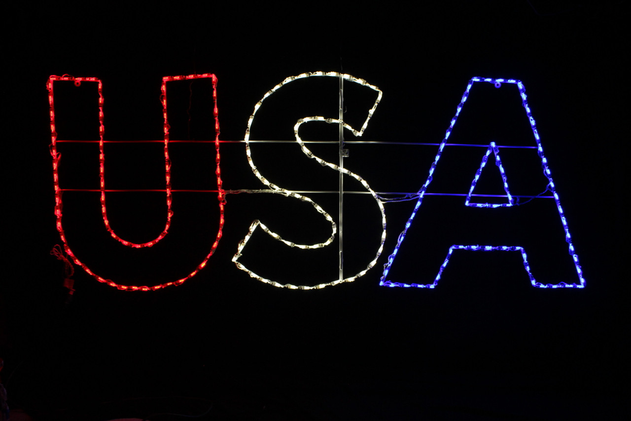 The USA sign coordinates with our Patriotic Heart display and Old Glory Flag display.